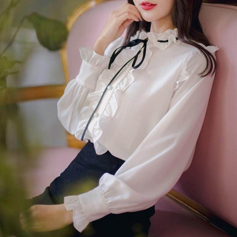 2024春秋衬衫女韩版新款 花边立领长袖雪纺百搭打底白修身上衣