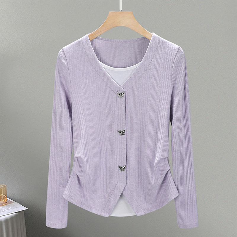 不规则设计感假两件亮丝拼接长袖t恤女春季内搭打底衫外穿上衣服