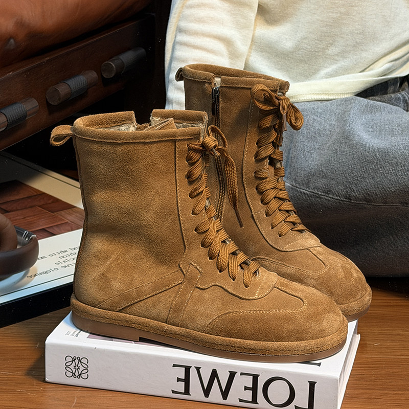 复古真皮系带平底马丁靴女2025冬季新款磨砂皮加绒勃肯鞋休闲短靴