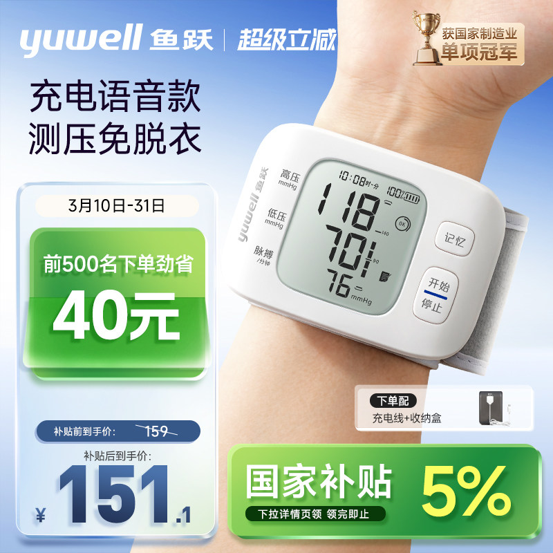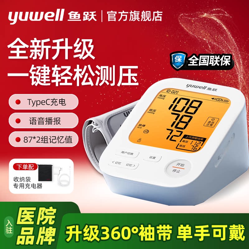 百亿鱼跃电子血压计高准度血压测量仪家用充电全自动高血压测压仪