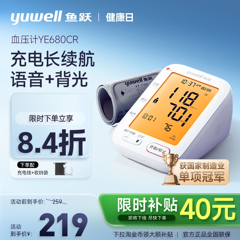 鱼跃电子血压计YE680AR家用医用级上臂式充电款语音大屏血压仪