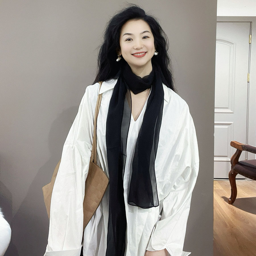明星同款露丝桑蚕丝真丝女春夏秋高级感时尚黑色真丝长条丝巾飘带