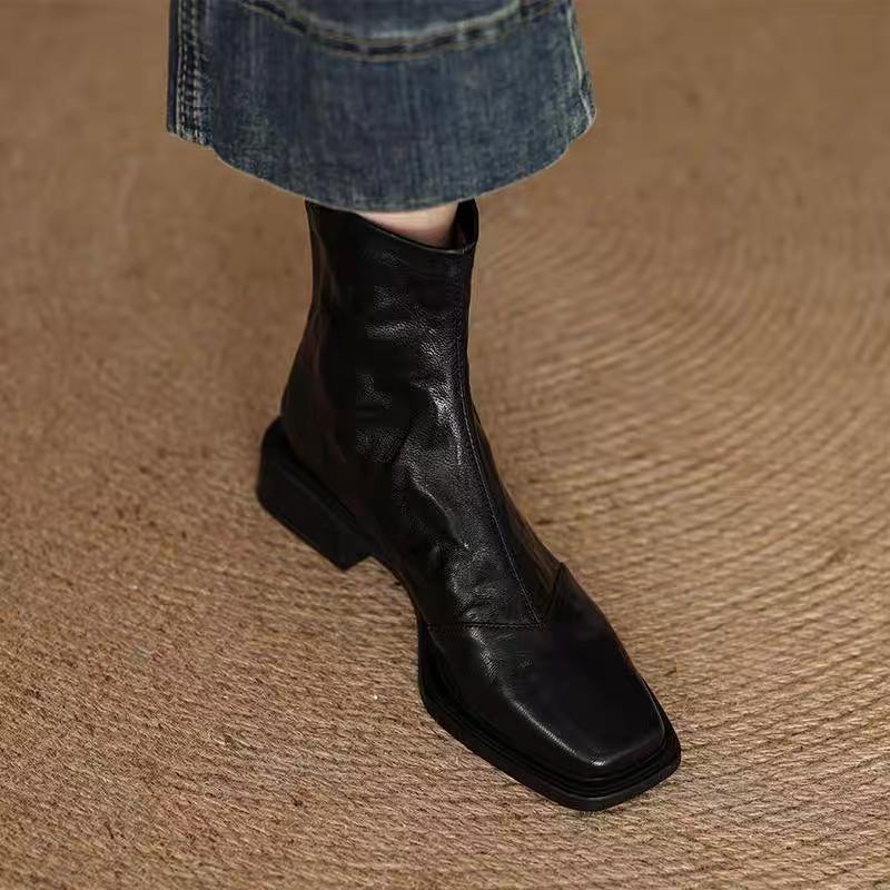 法式复古方头短靴女2025秋冬新款粗跟英伦风单靴子瘦瘦靴黑色靴子