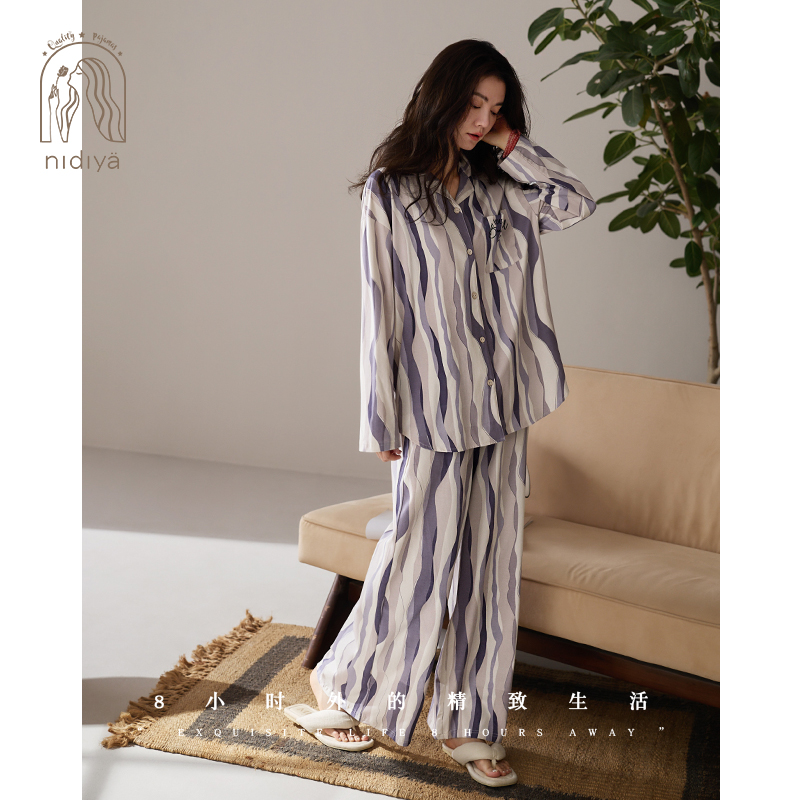 妮狄娅睡衣女春季柔软棉长袖时尚条纹开衫款春秋宽松版家居服套装