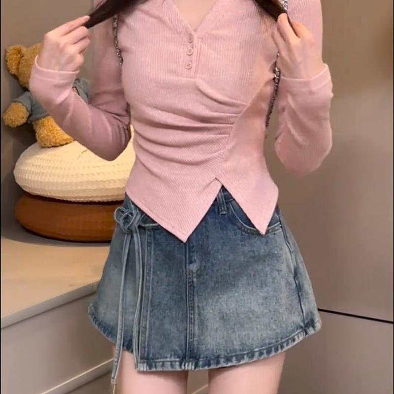 春季时尚套装女甜辣风粉色褶皱掐腰长袖上衣水洗牛仔半身裙两件套