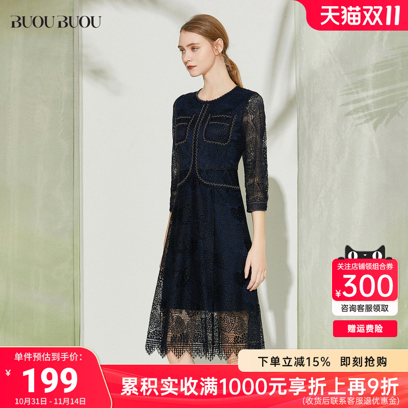 【库存告急】Buou Buou初秋新法式蕾丝钩花九分袖连衣裙女BI1G007
