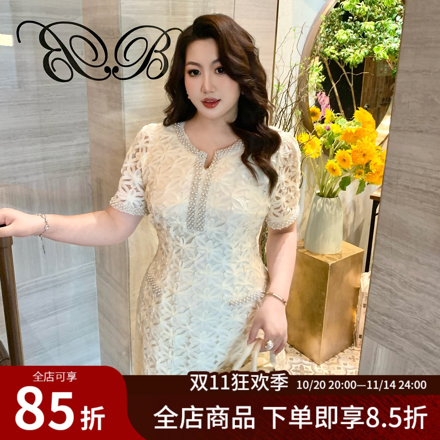 GLEC大码女装2025年夏季新款法式重工轻奢钉珠立体勾花蕾丝连衣裙