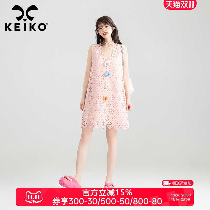 KEIKO [立体扎花] 镂空勾花蕾丝连衣裙夏多巴胺穿搭无袖A字背心裙