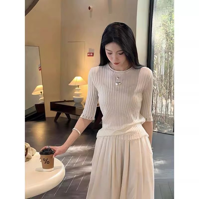 高级感白色冰丝针织短袖t恤女夏季修身五分袖内搭打底衫中袖上衣