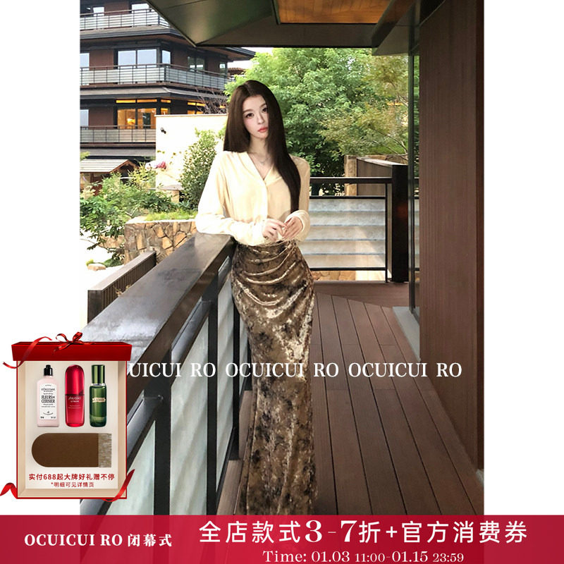 CUICUI崔崔【优雅新月】御姐系气质丝绒衬衫上衣+包臀半身裙套装