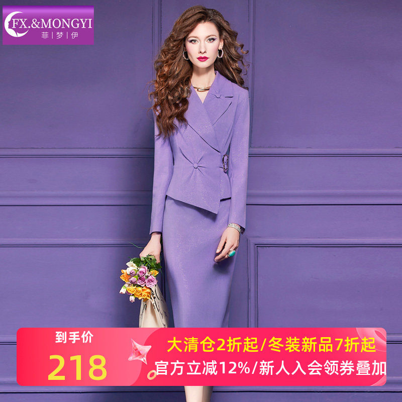 菲梦伊原创设计感紫色西装套装女秋季褶皱不规则气质西服包臀半裙