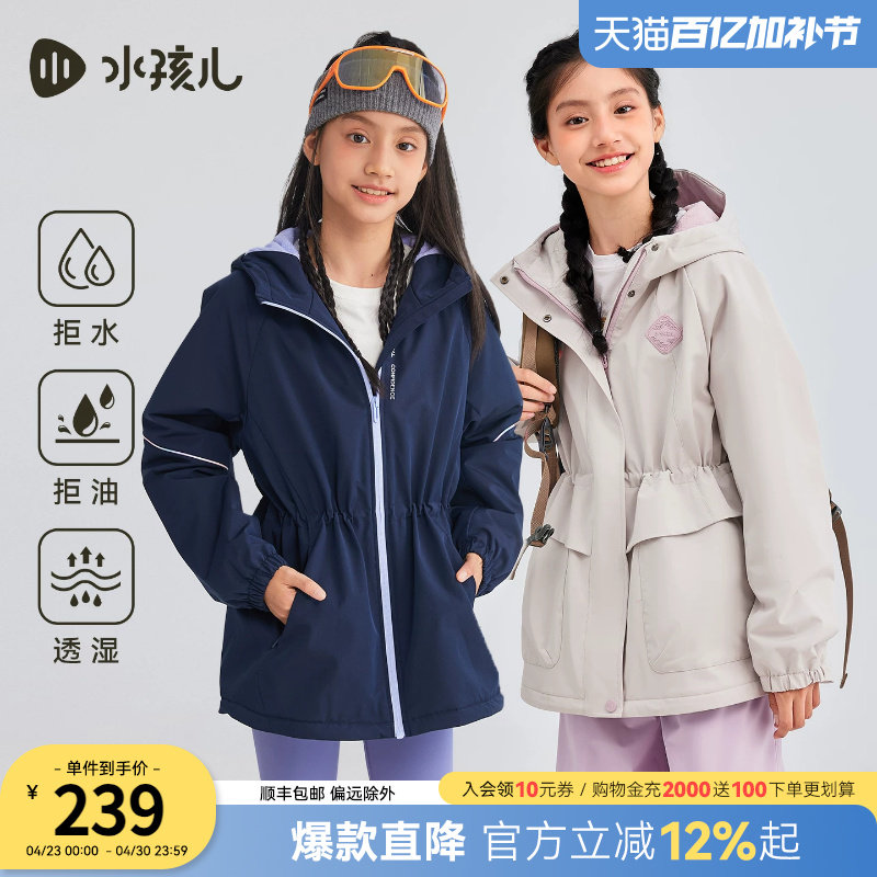 水孩儿童装加绒外套女童春装新款青少年三防透湿厚风衣初中生上衣