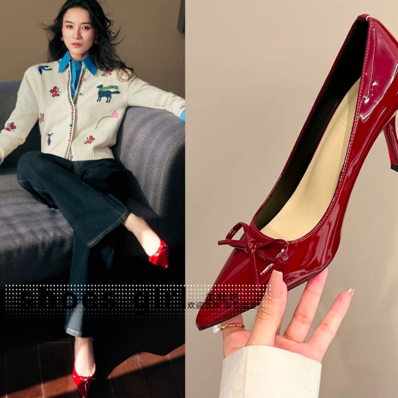 宋佳同款红色高跟鞋细跟尖头浅口蝴蝶结漆皮单鞋女新年本命年鞋子