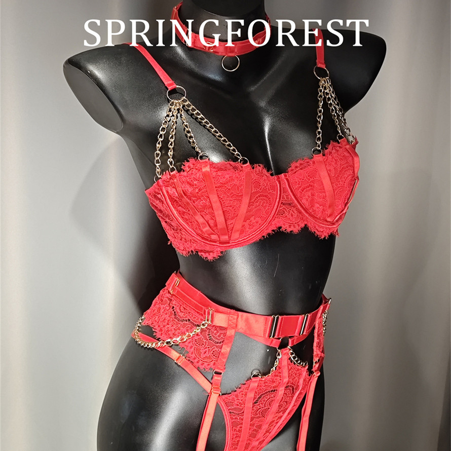 AH文胸套装超薄款欧美性感蕾丝透明大胸显小本命年红色结婚内衣女