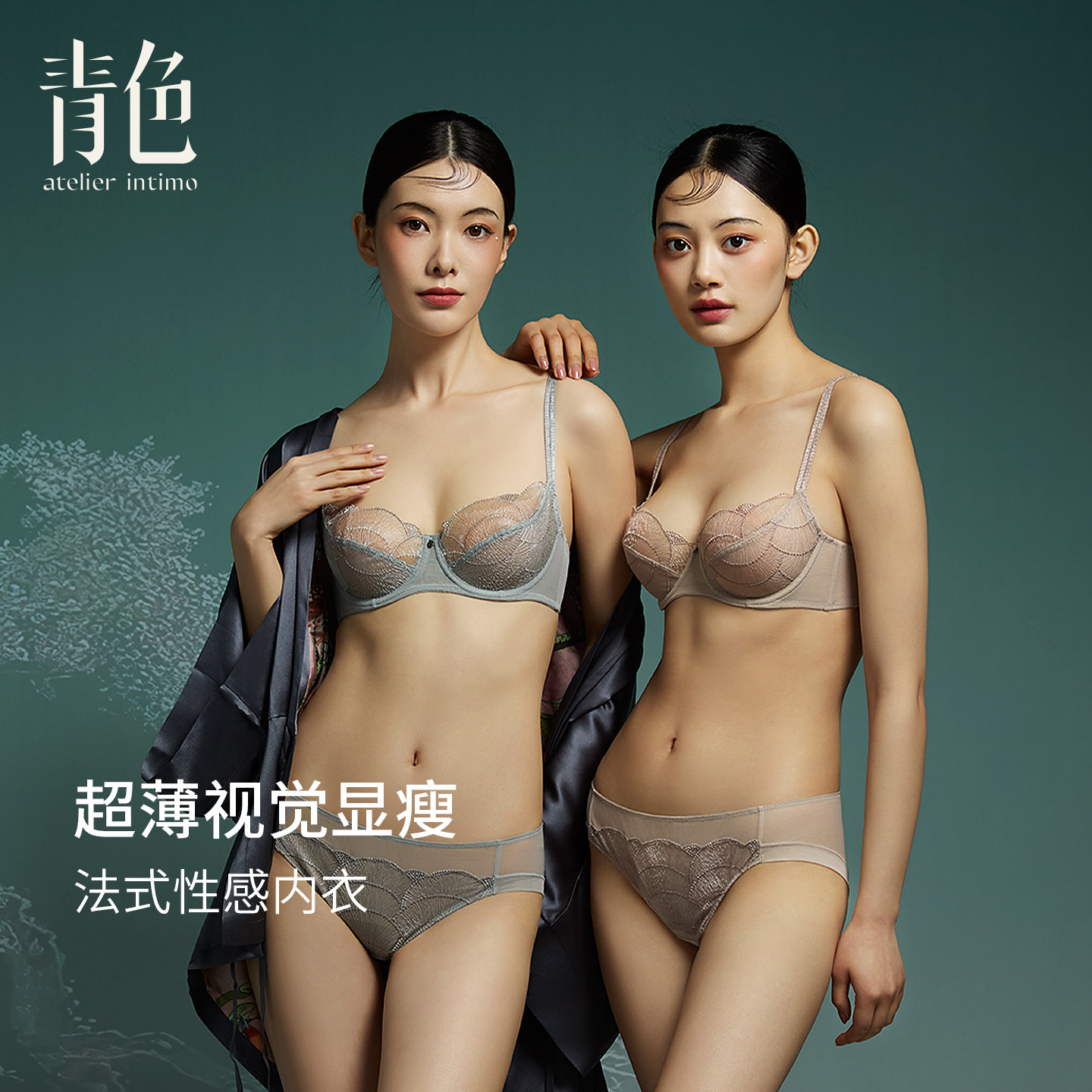 【空桑】青色性感超薄手工睫毛蕾丝内衣大胸显小收副乳防下垂文胸