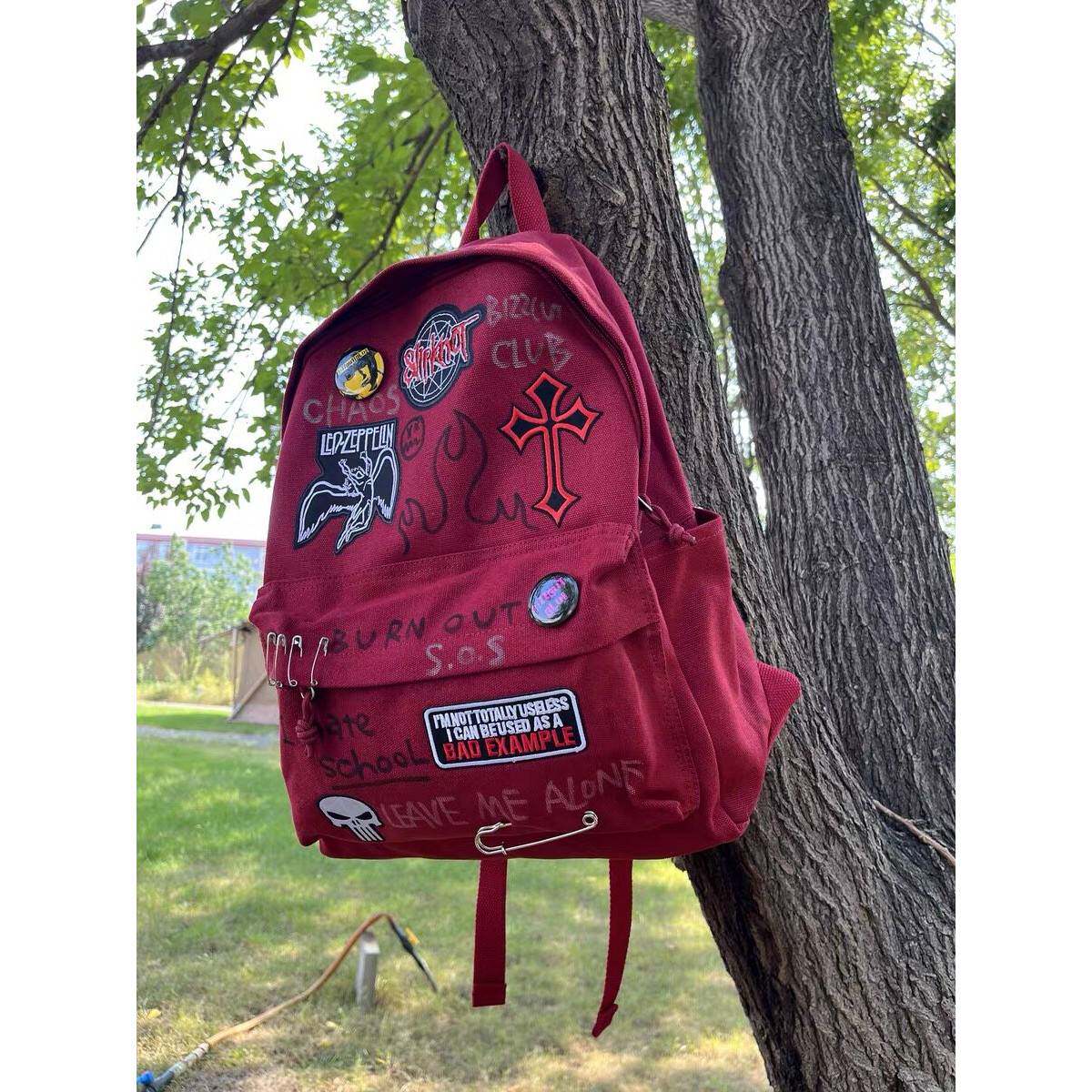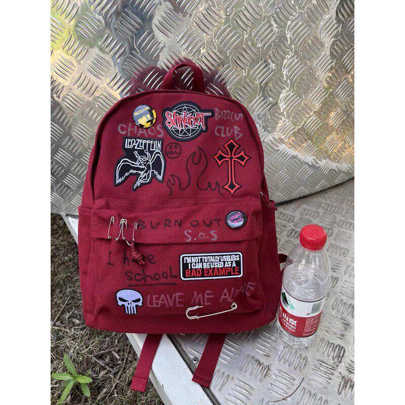 美式摇滚酒红色双肩包女校园朋克亚文化学生大容量书包涂鸦背包男