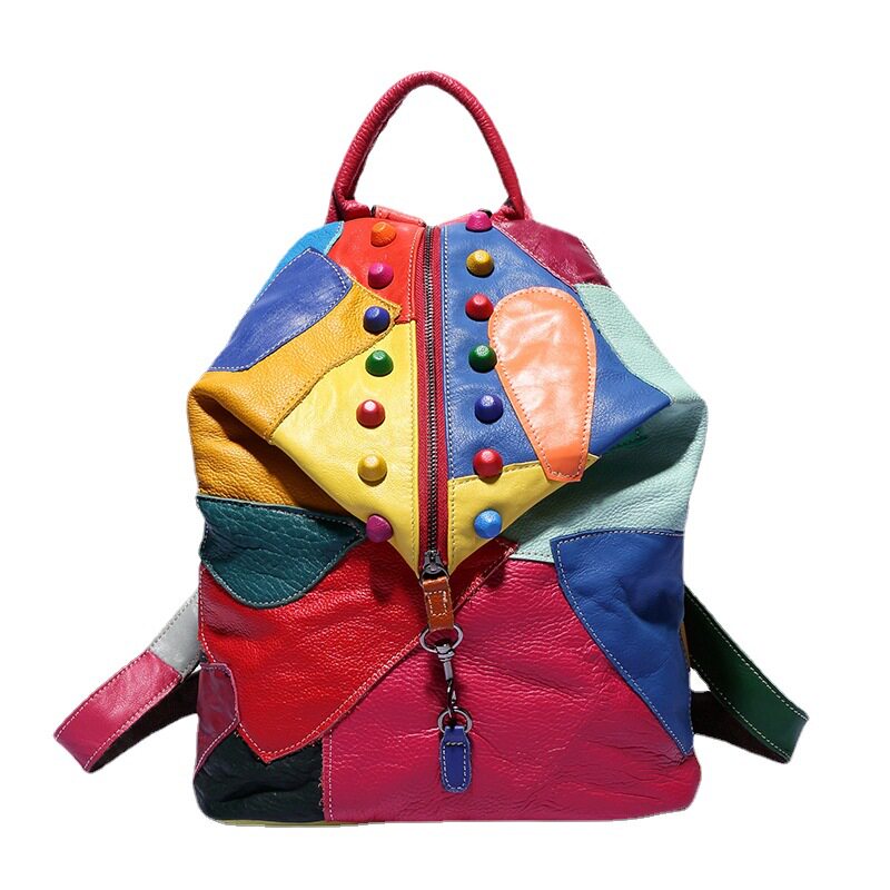 米菲儿女包头层牛皮手机女式旅行旅游拼接背包朋克双肩包七彩包包