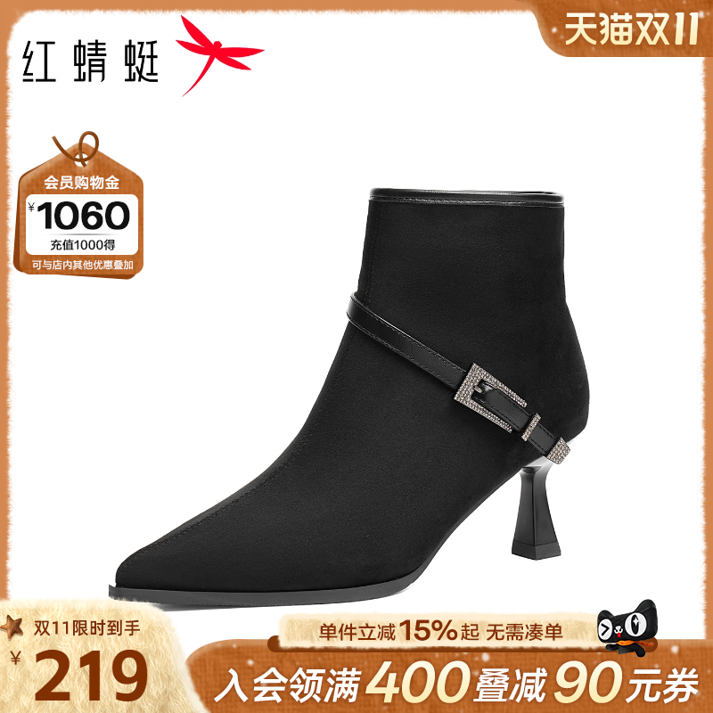 红蜻蜓高跟鞋女细跟短靴2025冬季新款女鞋靴子黑色洋气尖头瘦瘦靴