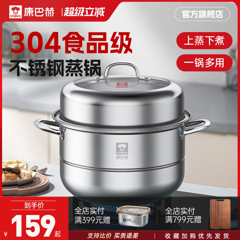 康巴赫食品级304不锈钢蒸锅防烫家用煤气灶通用蒸鱼蒸馒头3层加厚