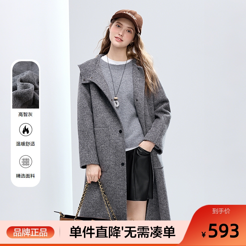 【羊绒】菲妮迪连帽中长款毛呢外套2024年冬季新款双面呢子大衣女