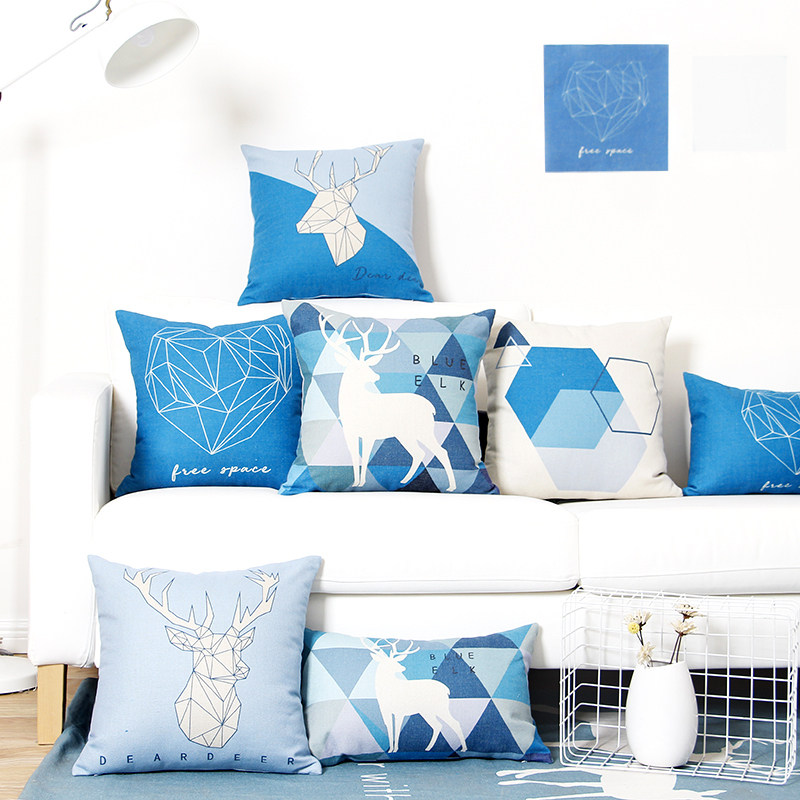 蓝色几何小鹿北欧棉麻布艺抱枕套客厅沙发靠垫办公室抱枕靠枕腰靠