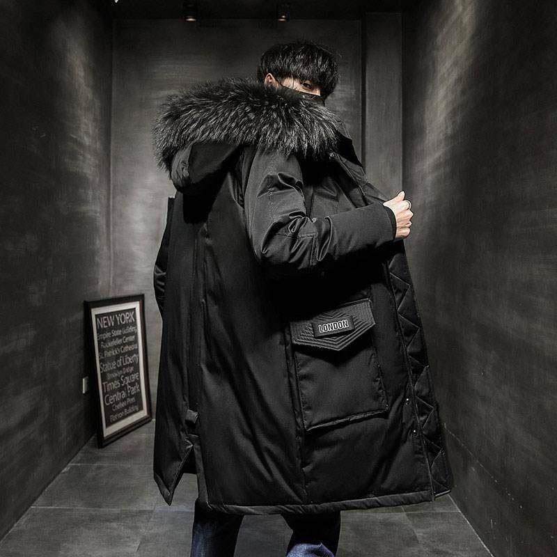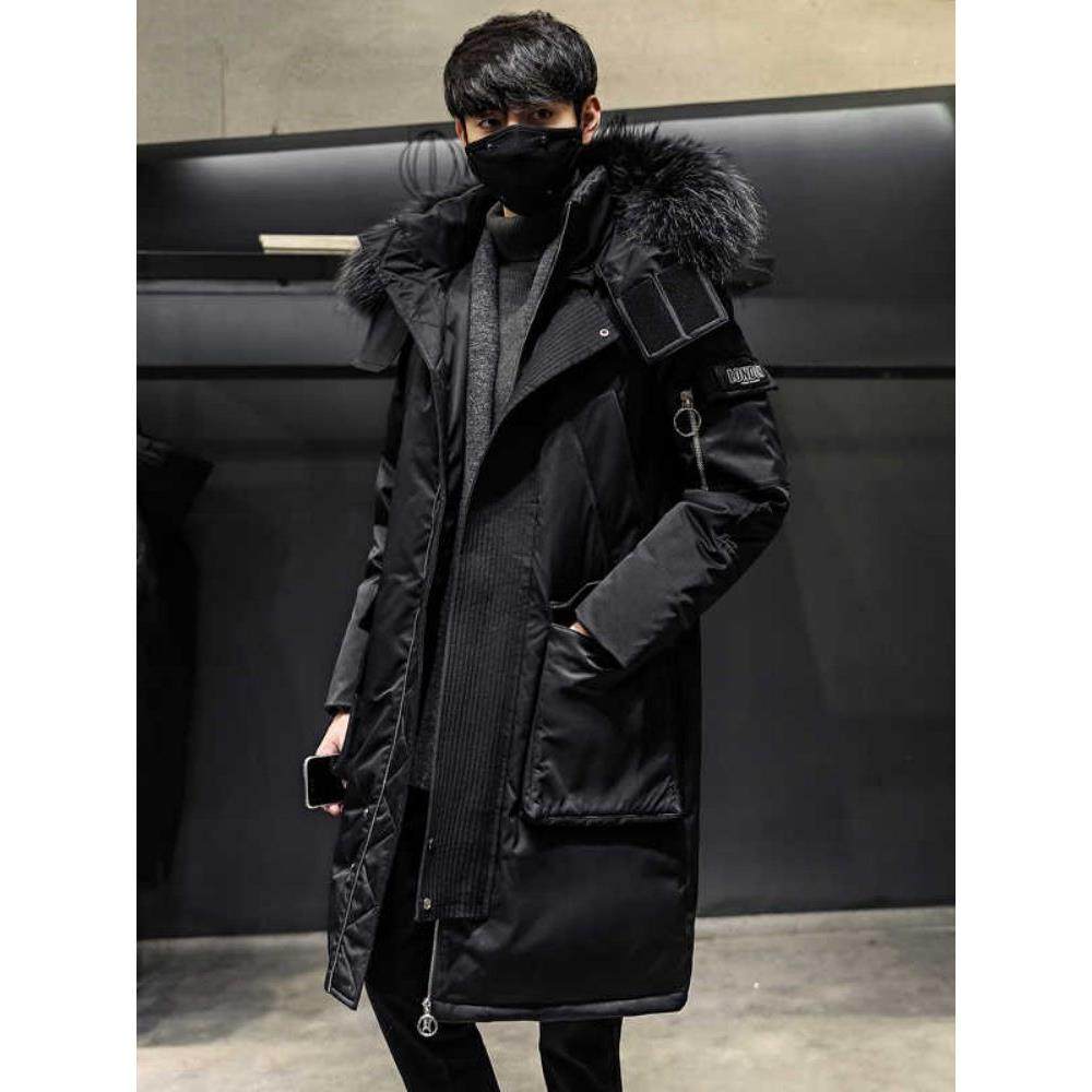 潮牌男士中长款羽绒服秋冬季加厚大毛领白鸭绒派克服学生休闲外套