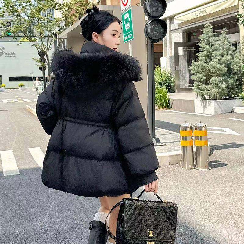 韩国代购大毛领鸭绒服女2025冬季翻领抽绳收腰修身保暖羽绒服外套