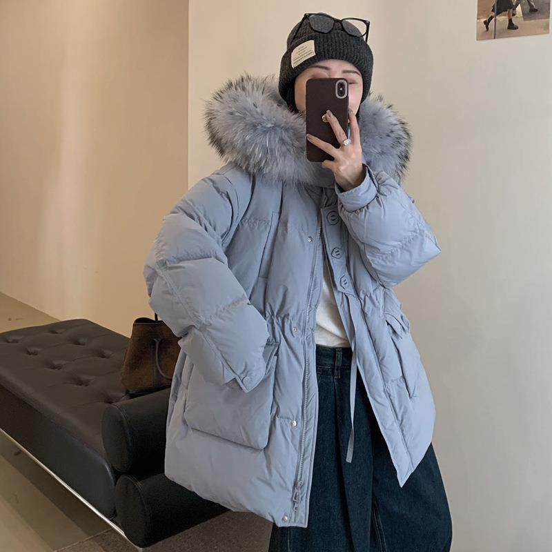 韩国代购女装2025冬款温暖帅气时尚宽大时髦毛领连帽鸭绒羽绒服