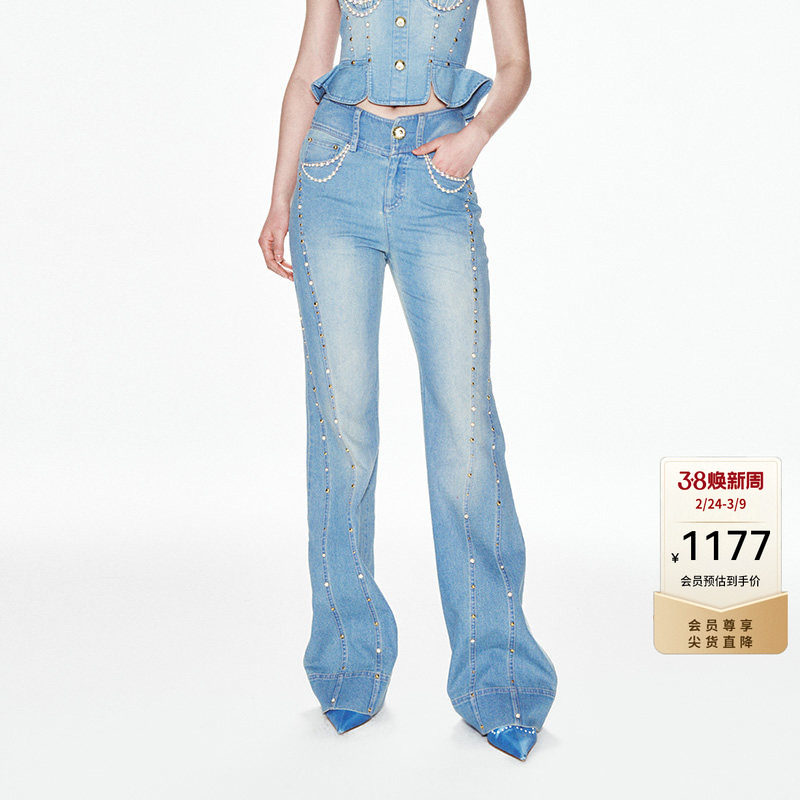 【明星同款】lefame拉飞姆华丽烫片牛仔喇叭裤微喇裤女款裤子