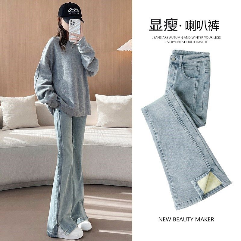 开叉加绒喇叭裤女款2025年秋冬新款高腰爆款浅色弹力微喇牛仔裤子