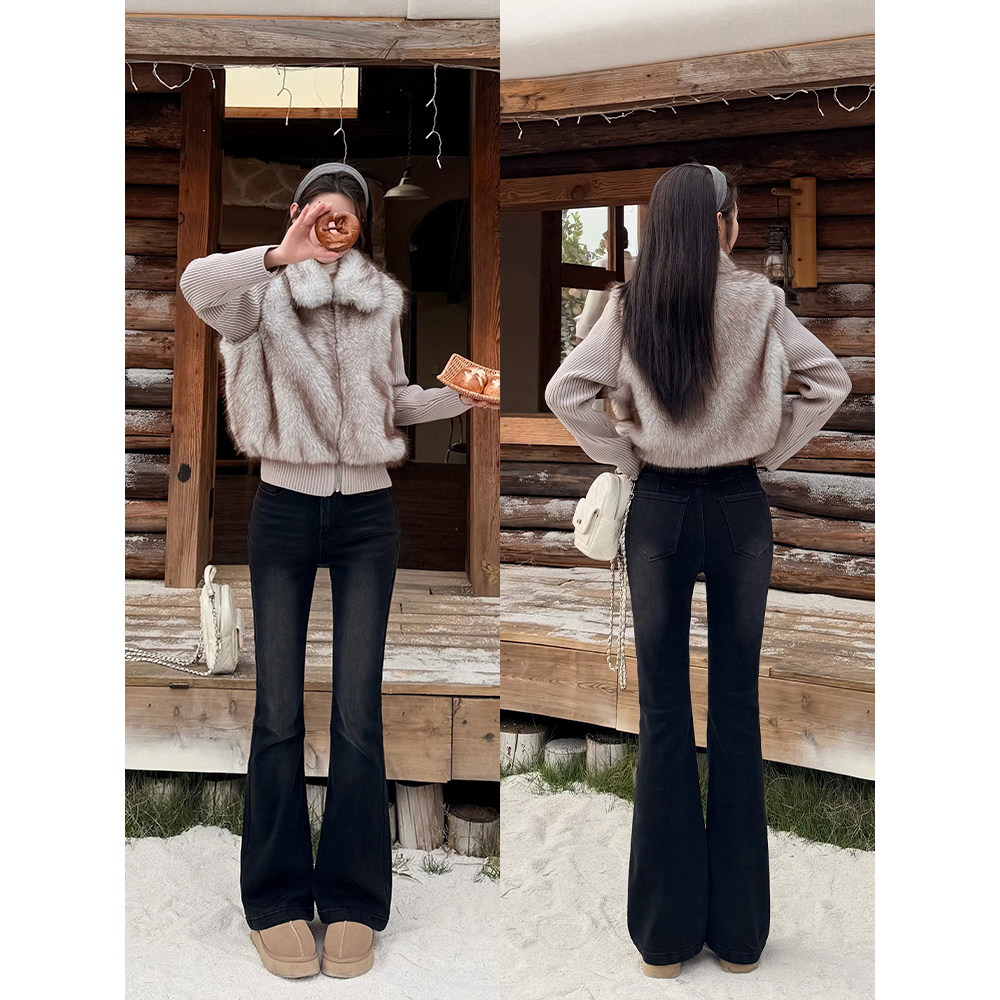 LILY2025秋冬小个子女款复古美式修身加绒休闲高腰微喇叭牛仔长裤