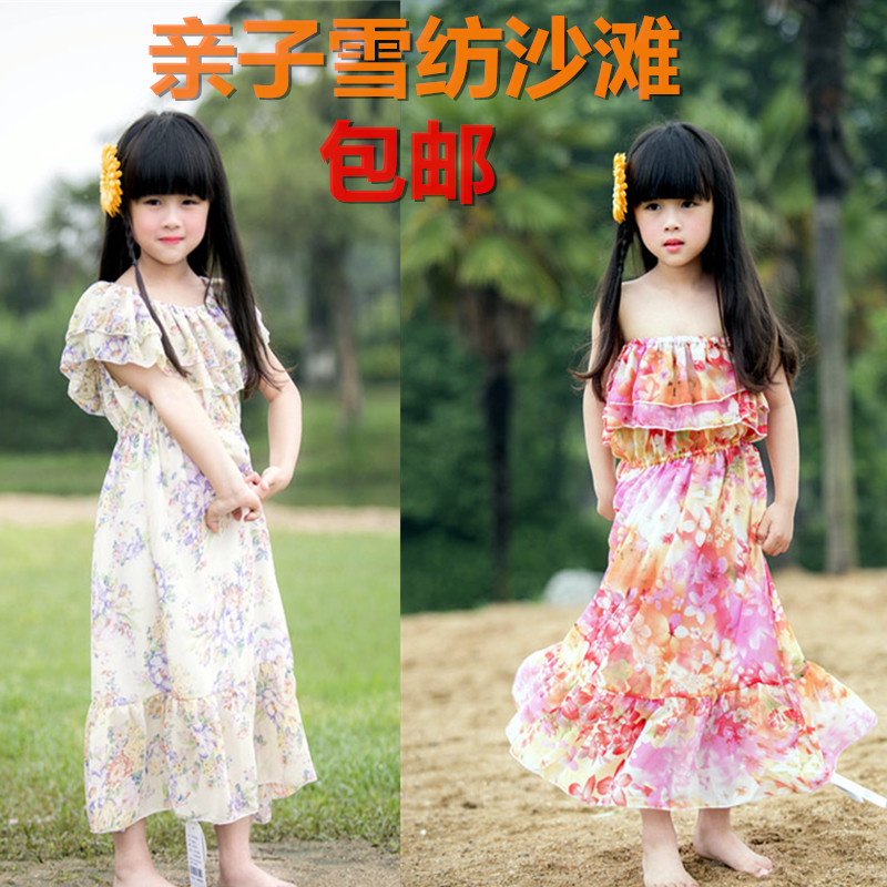 夏季新款女童雪纺碎花沙滩裙 中大童波西米亚雪纺海滩长裙母女装