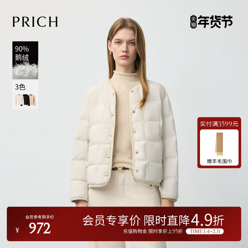 【90%鹅绒】PRICH时尚圆领格子轻盈保暖羽绒服2025冬季新款外套女