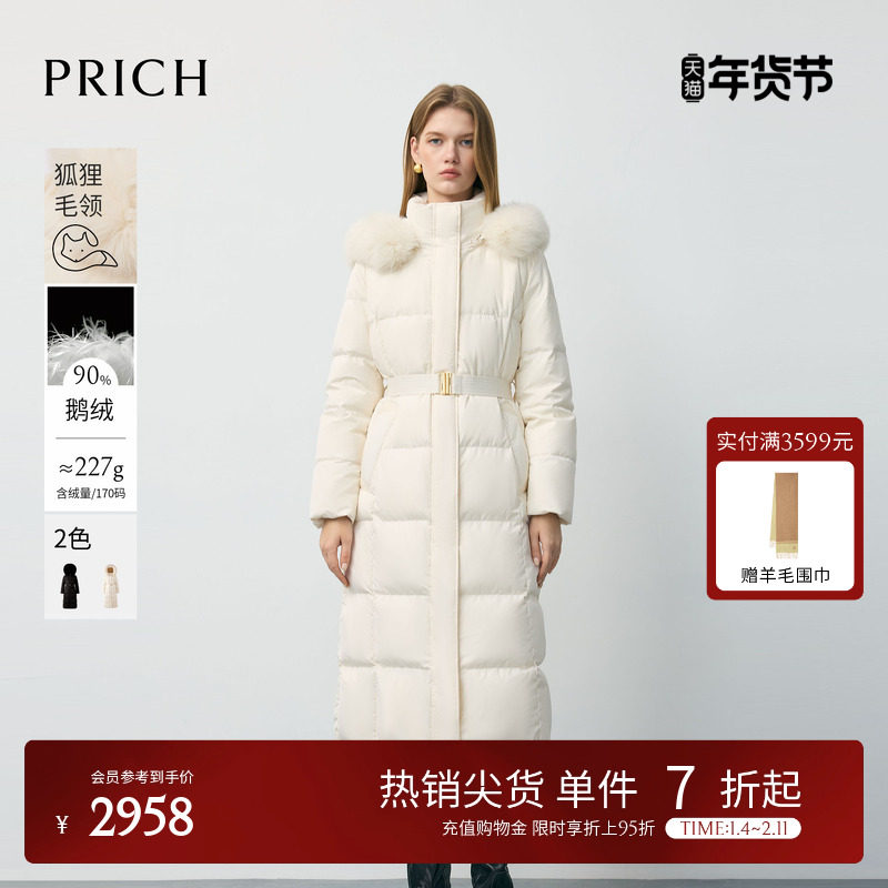 【90%鹅绒】PRICH时尚连帽蓬松毛领收腰保暖长羽绒服2025冬新款女
