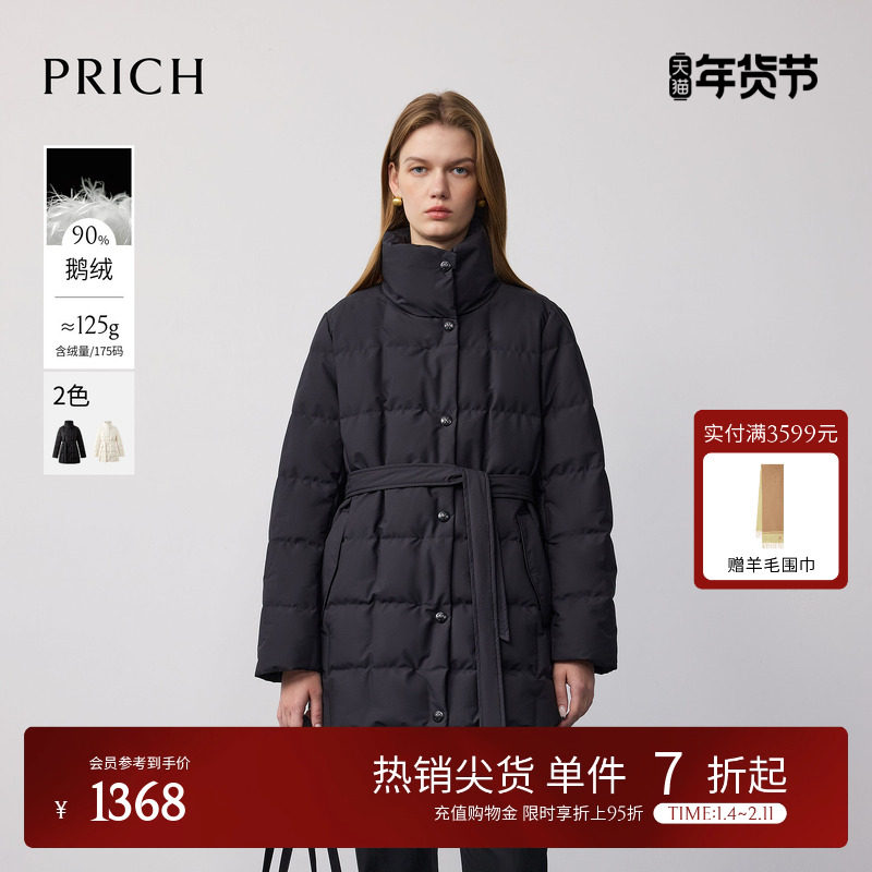 【90%鹅绒】PRICH时尚简约过膝长款羽绒服2025冬季新款锁温保暖女