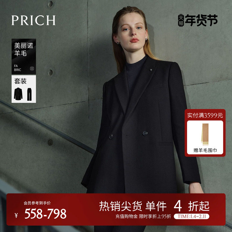 【美丽诺羊毛】PRICH双排扣西装套装春秋新款宽松显瘦外套女