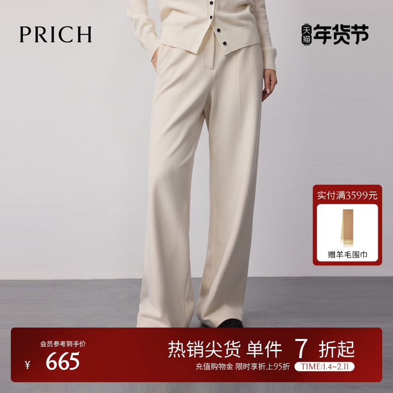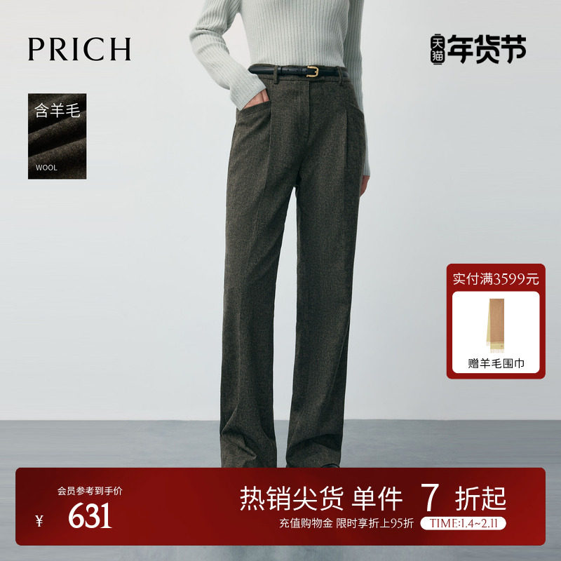 PRICH时尚提花肌理直筒羊毛西装裤2025冬新款橡筋腰头通勤长裤女
