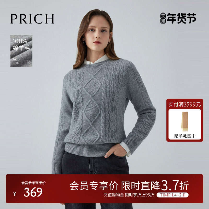 【100%绵羊毛】PRICH复古圆领针织衫冬季新款保暖显瘦上衣女