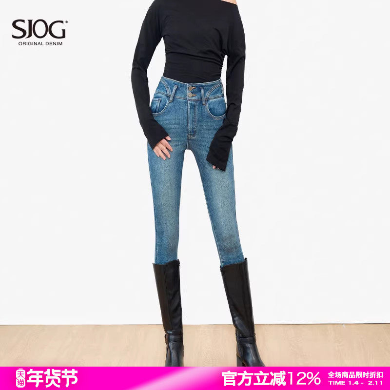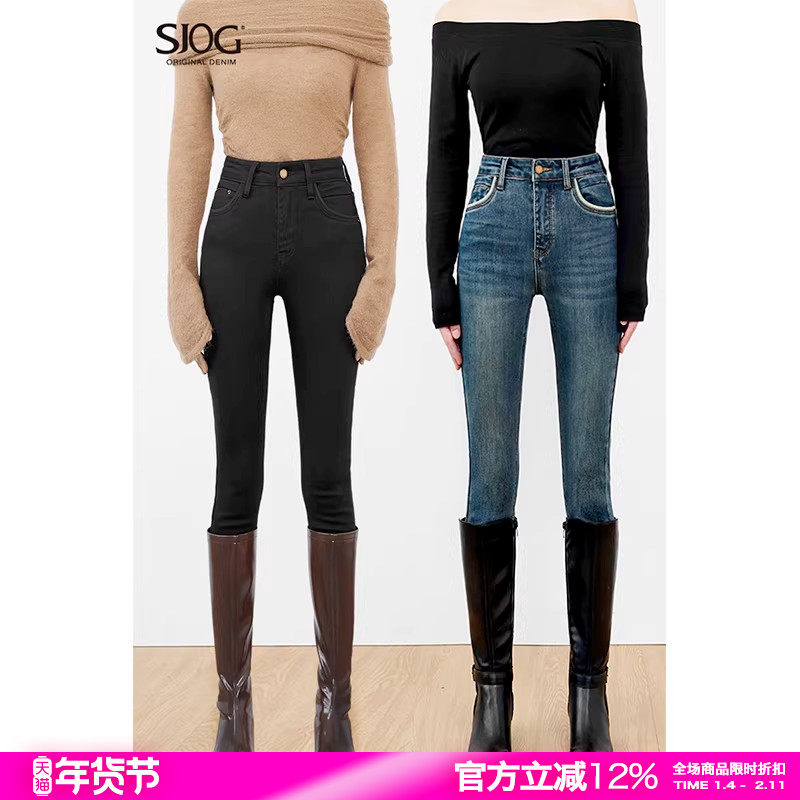 SJOG塑形不堆叠!加绒高腰提臀靴裤牛仔裤女九分紧身小脚裤铅笔裤