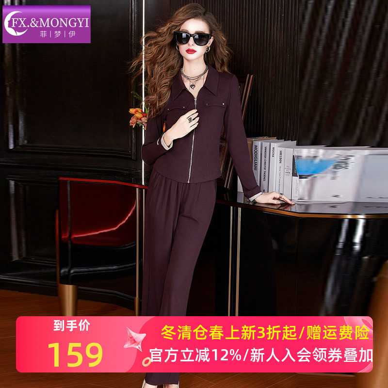 菲梦伊运动时尚套装女秋季翻领修身拉链开衫外套宽松阔腿裤两件套
