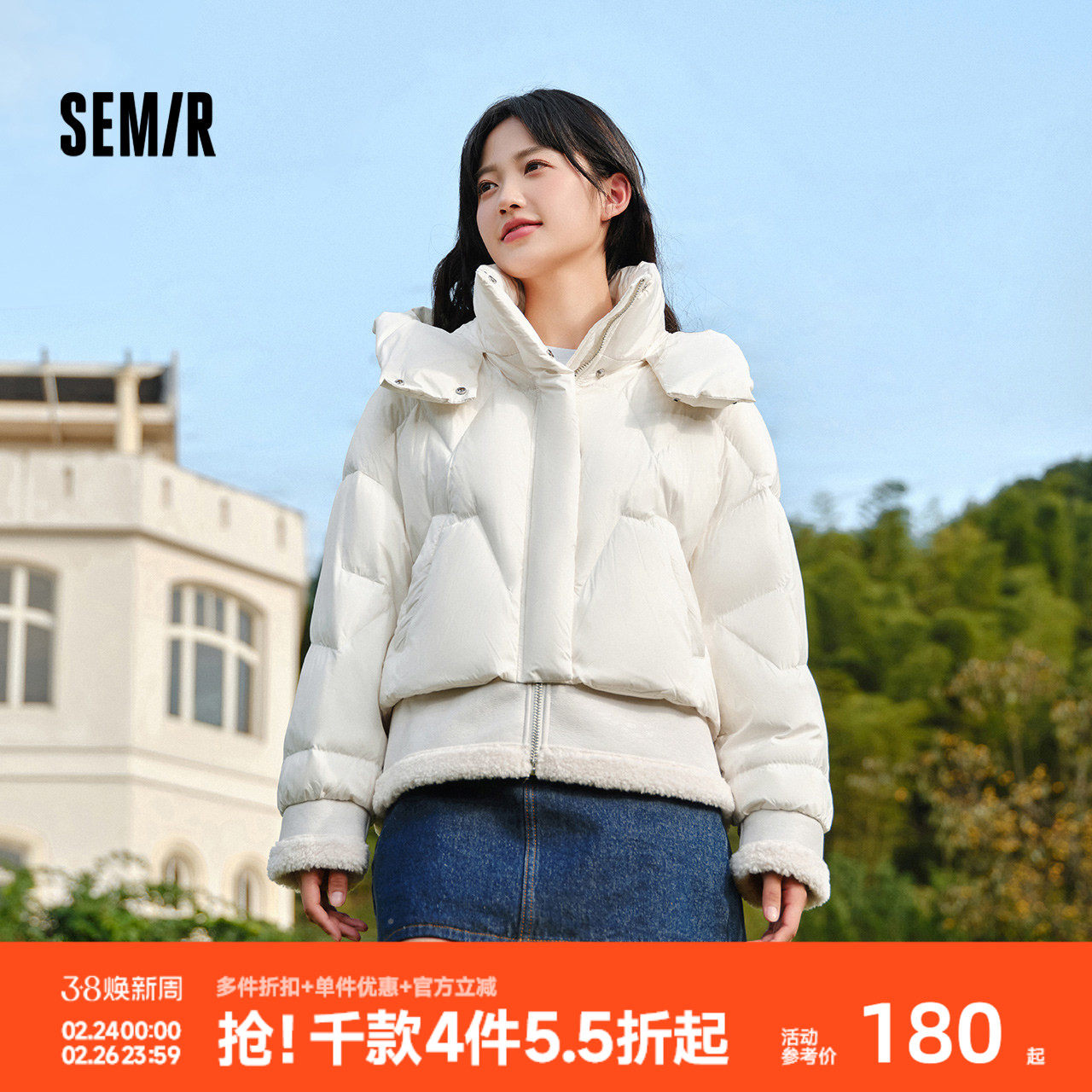 森马羽绒服女2024冬季新款拼接假两件设计感面包服宽松连帽外套女
