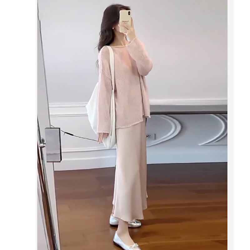 孕妇连衣裙套装春秋2024新款粉色圆领毛衣吊带裙甜美宽松两件套女