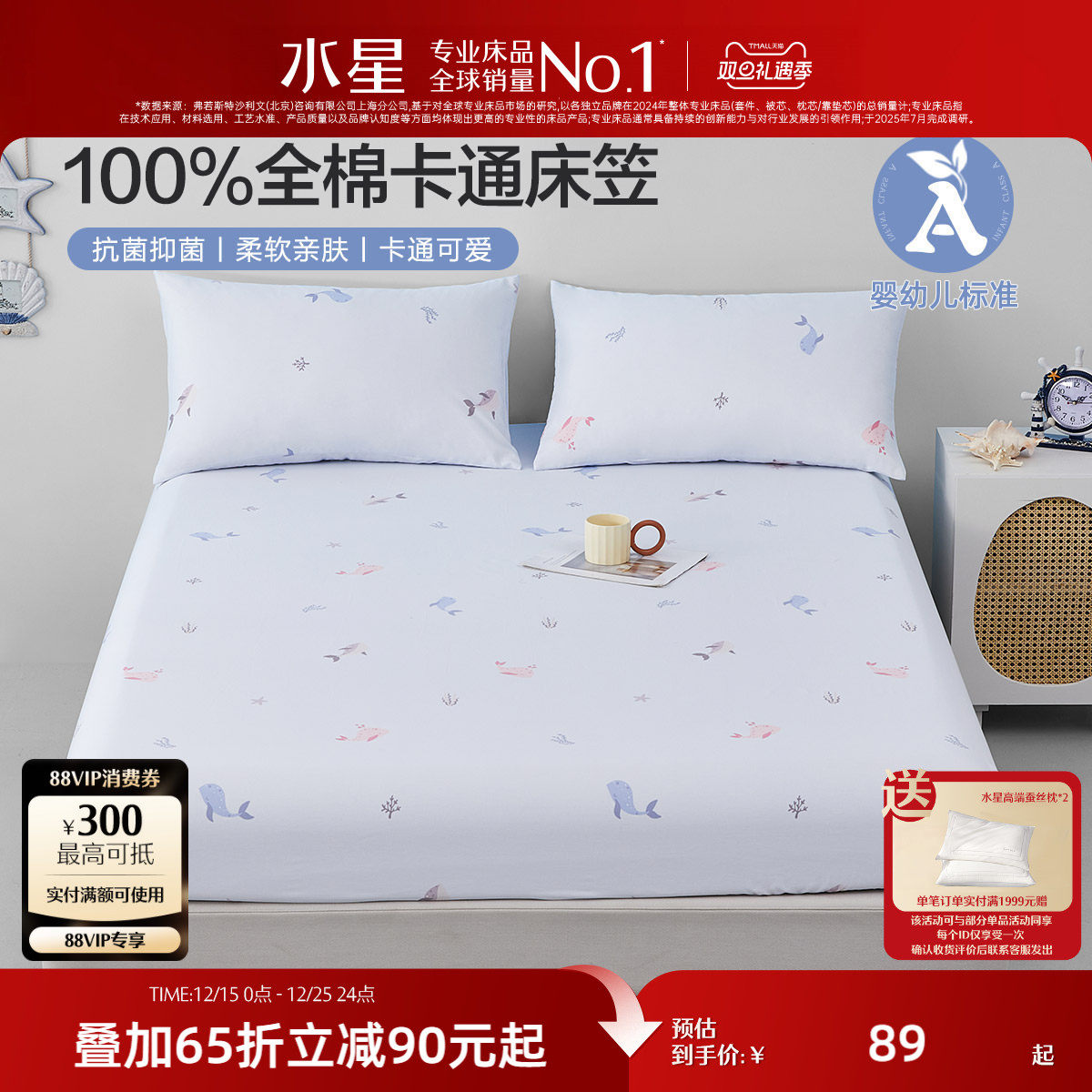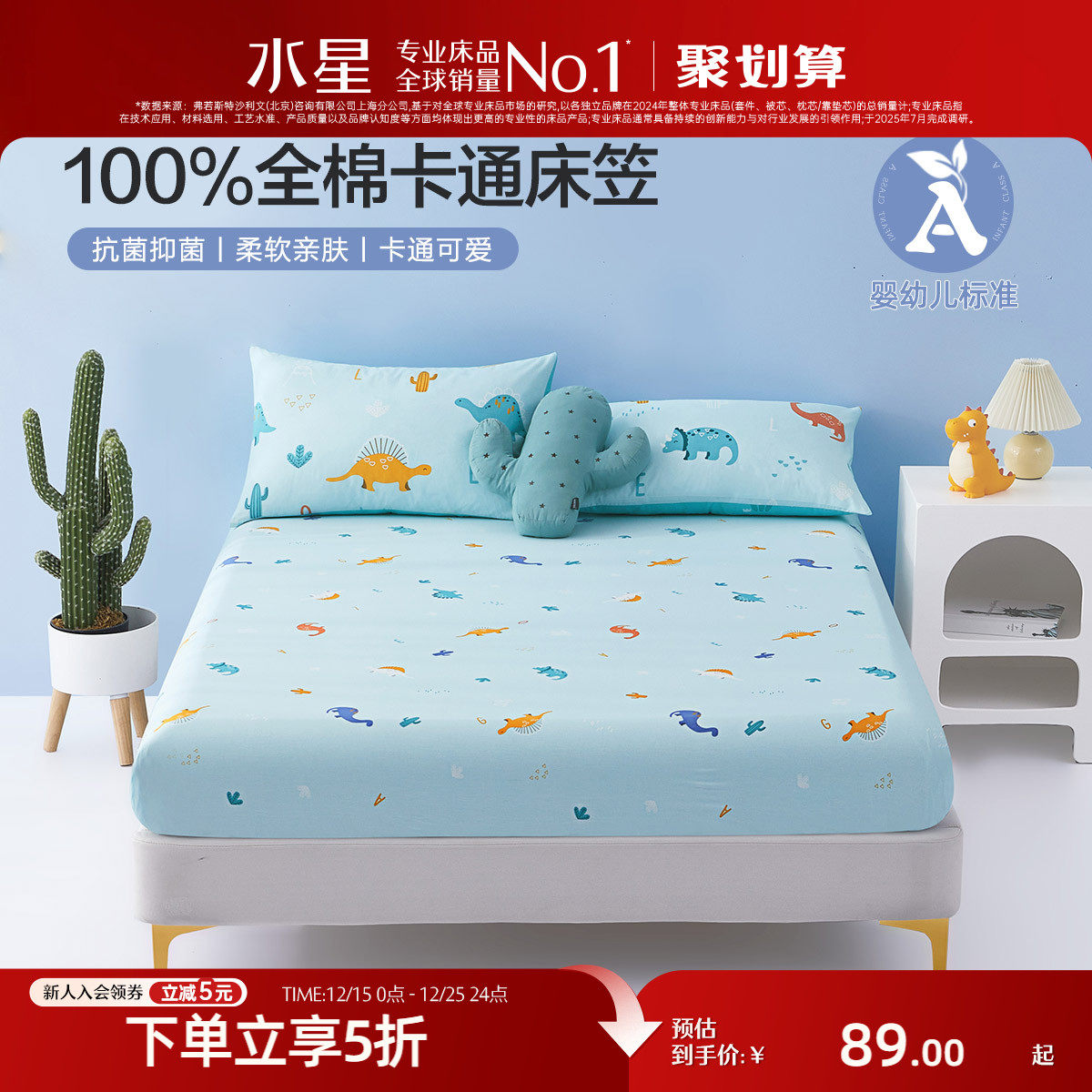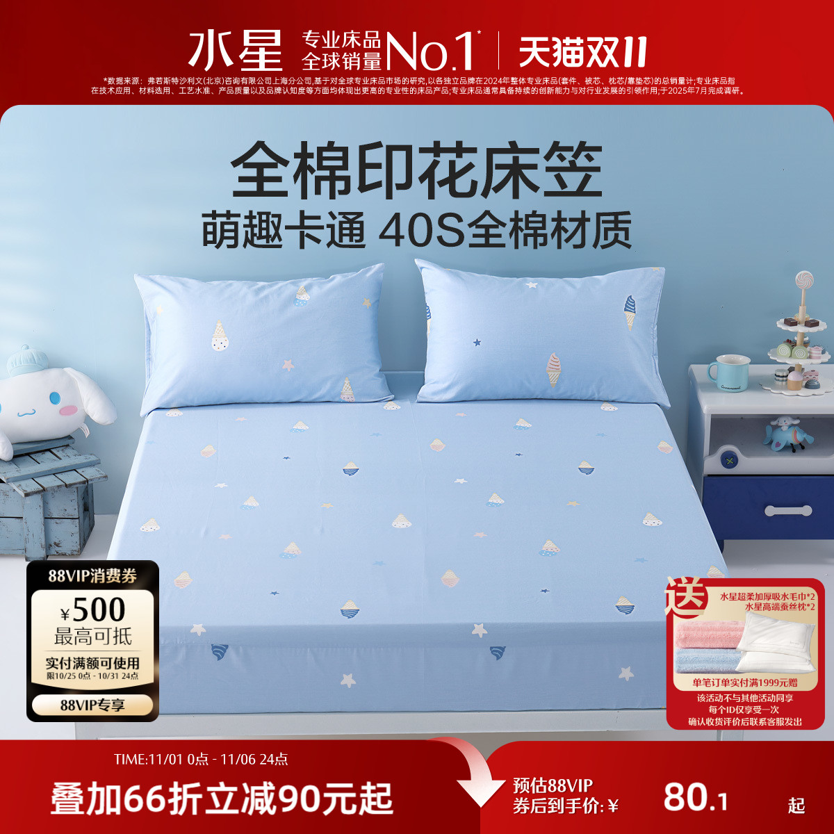水星家纺儿童床笠单件A类抑菌全棉印花床罩100纯棉床垫保护套床品