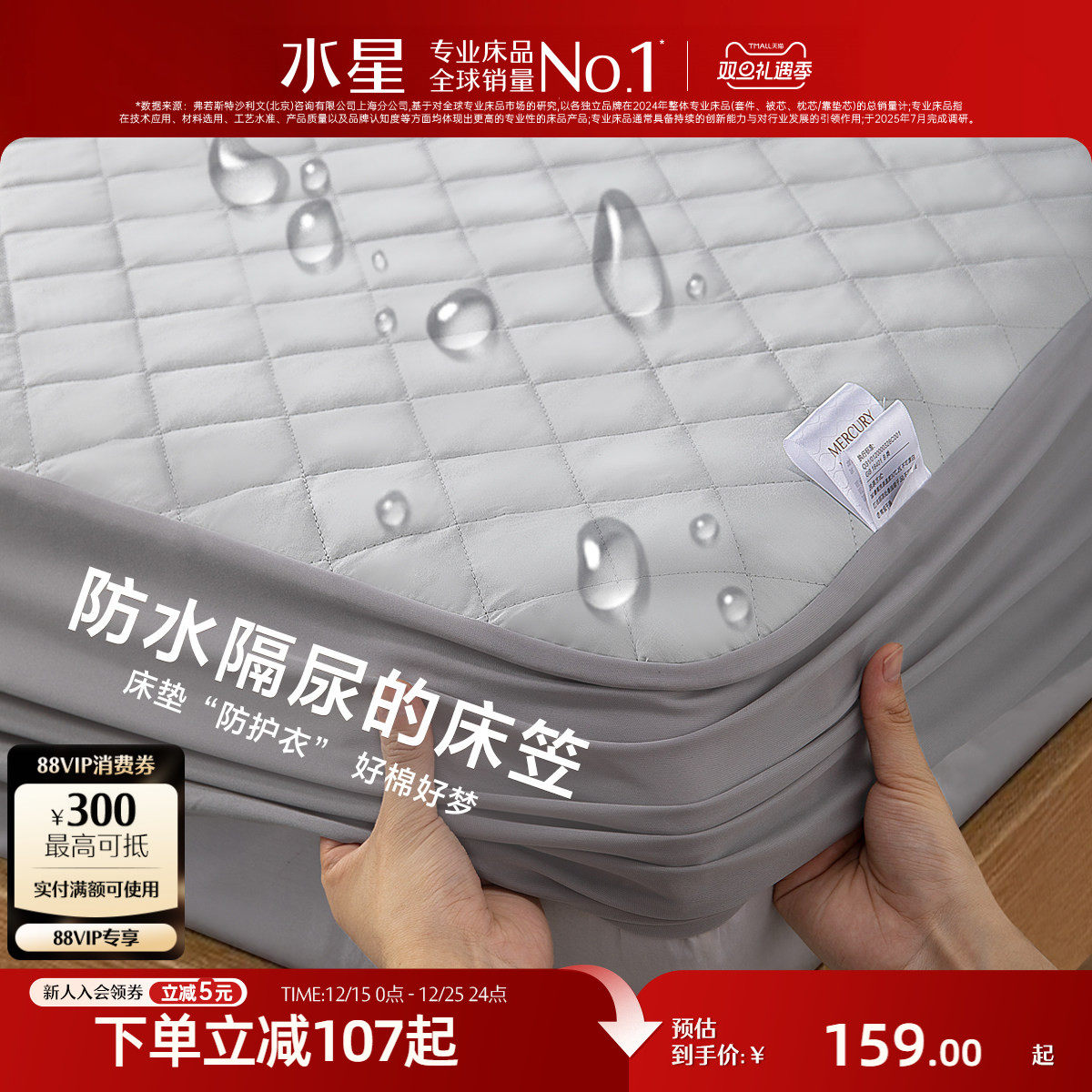 水星家纺床笠单件防水床罩席梦思床垫保护罩防尘床套罩隔尿床单罩