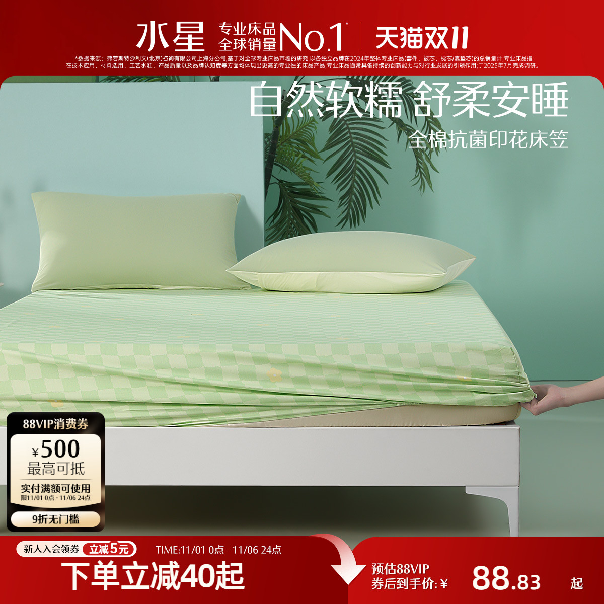 水星家纺全棉床笠单件100%纯棉抗菌印花床垫保护套床罩家用床品