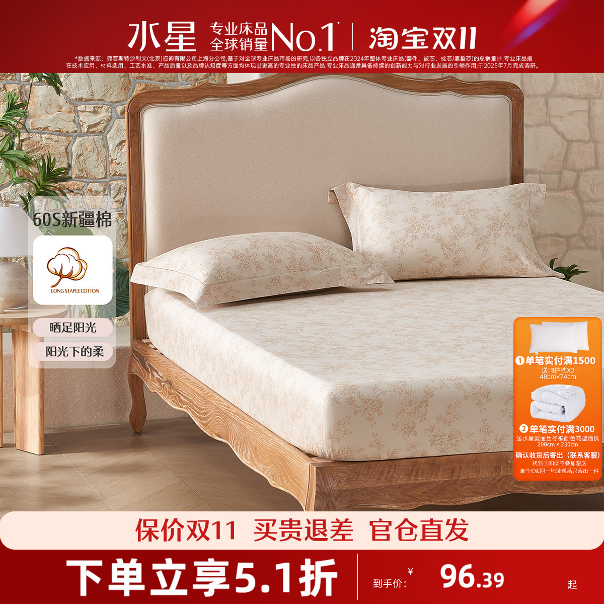 水星家纺床笠单件60支长绒棉抑菌床垫保护套家用印花床罩轻奢床品