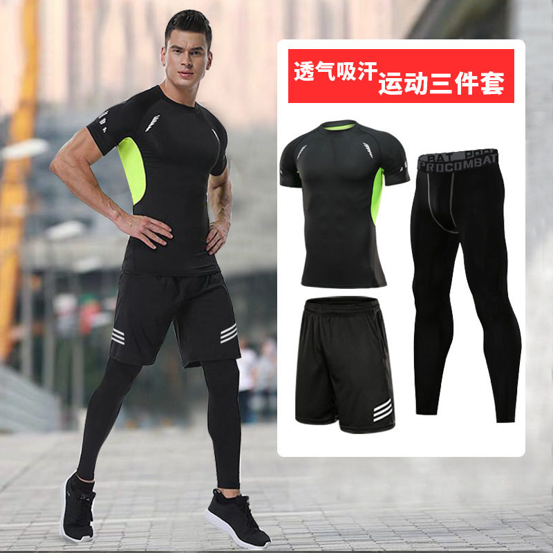 健身套装男晨跑三件套健身房速干紧身衣春夏季跑步运动套装训练服