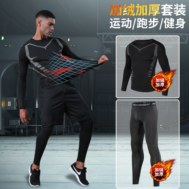 秋冬加绒健身服男三件套装运动套装跑步紧身衣篮球训练服装健身房