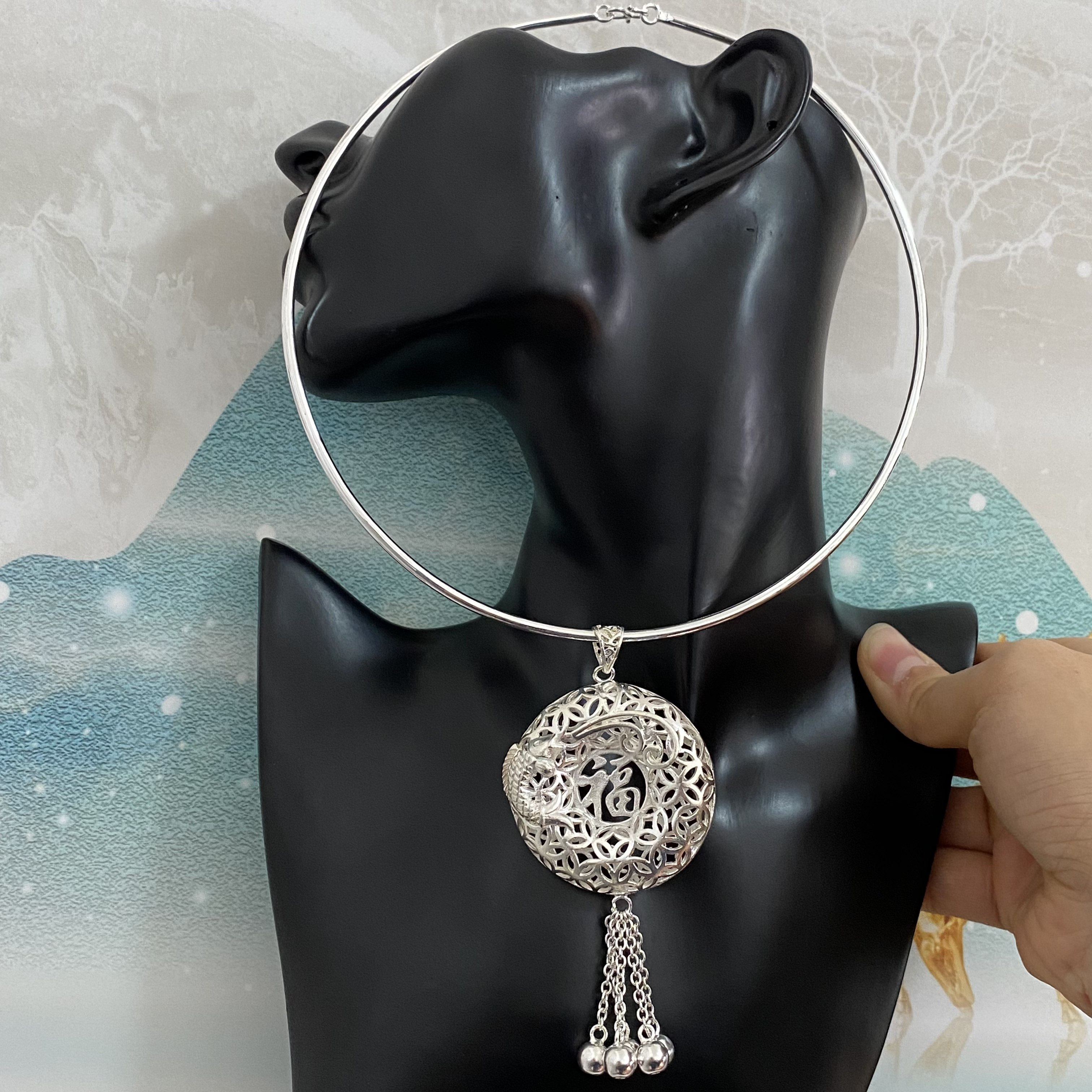 纯银荷花锦鲤流苏璎珞平安锁吊坠足银999项圈女款锁骨链汉服配饰