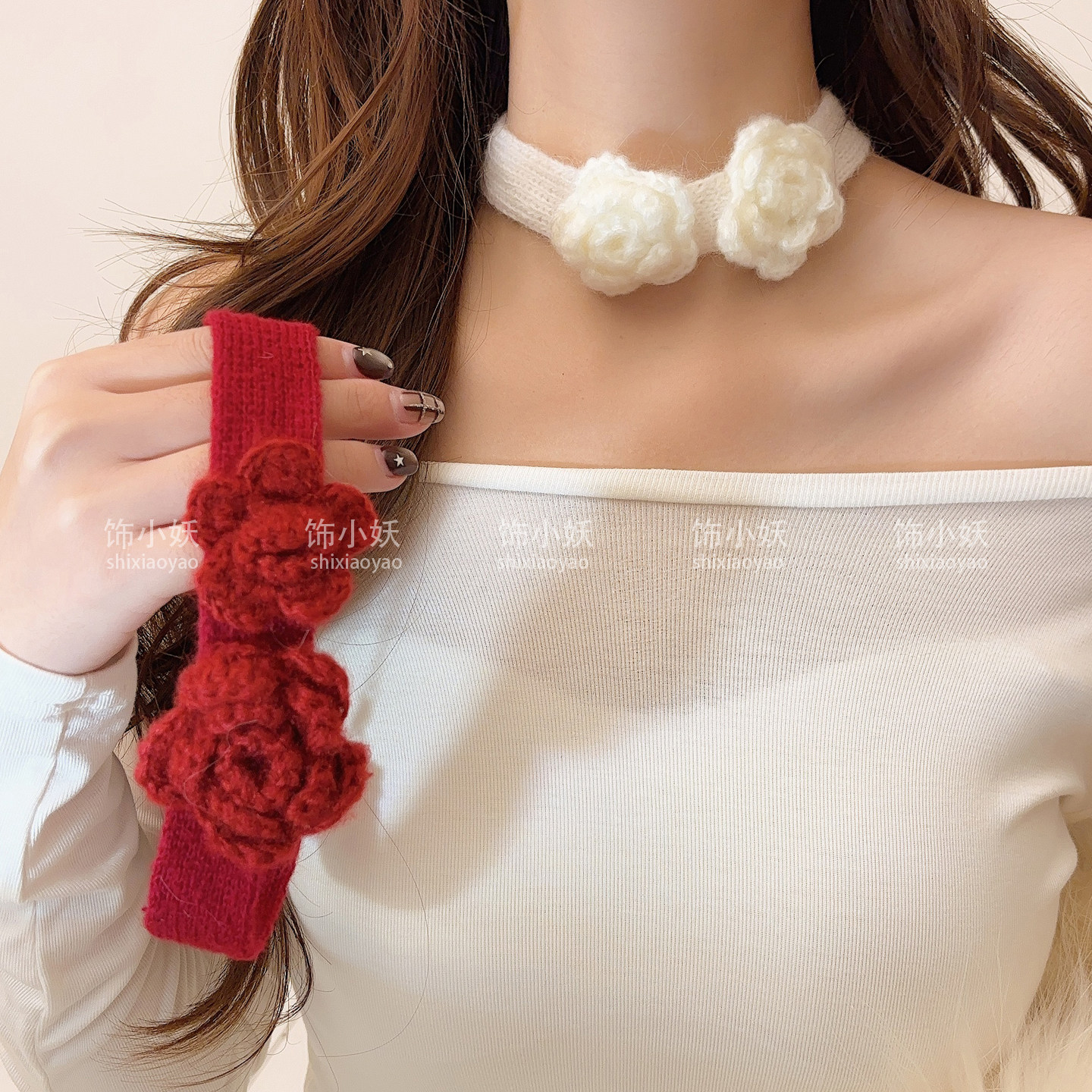 红色花朵毛衣项链女款圣诞节毛绒choker颈链秋冬毛衣链项圈配饰潮